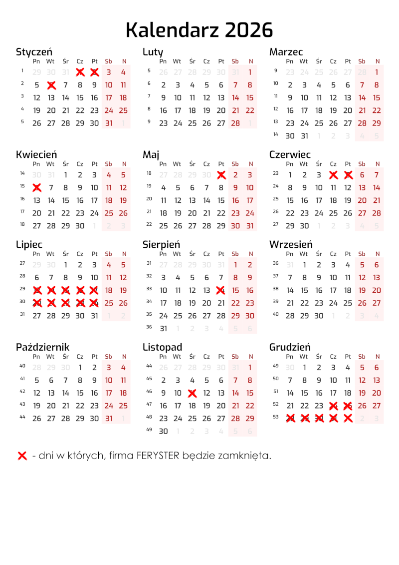 Dni w roku 2026 kiedy firma Feryster będzie zamknięta.